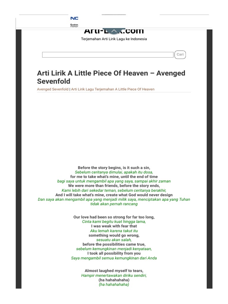 A Little Piece Of Heaven Lyrics Terjemahan