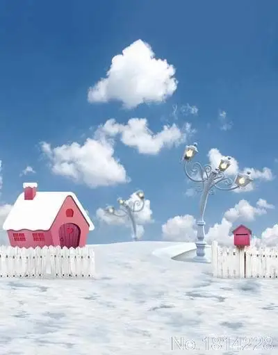 3x5ft Snowy Field Wood House Small Kids Blue Sky Studio Backdrop D